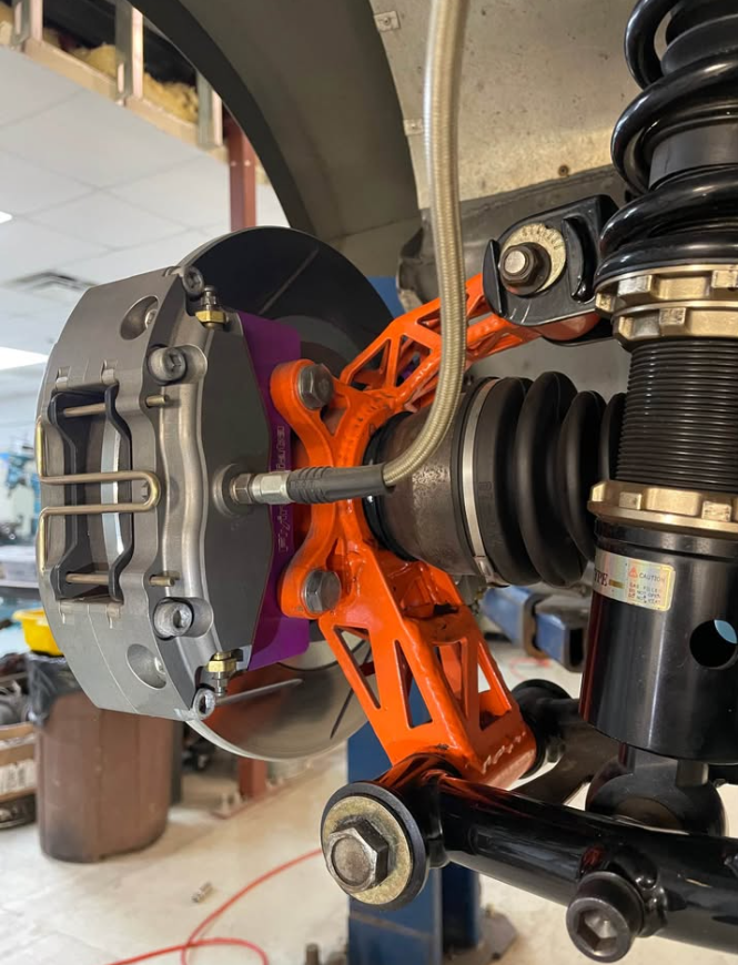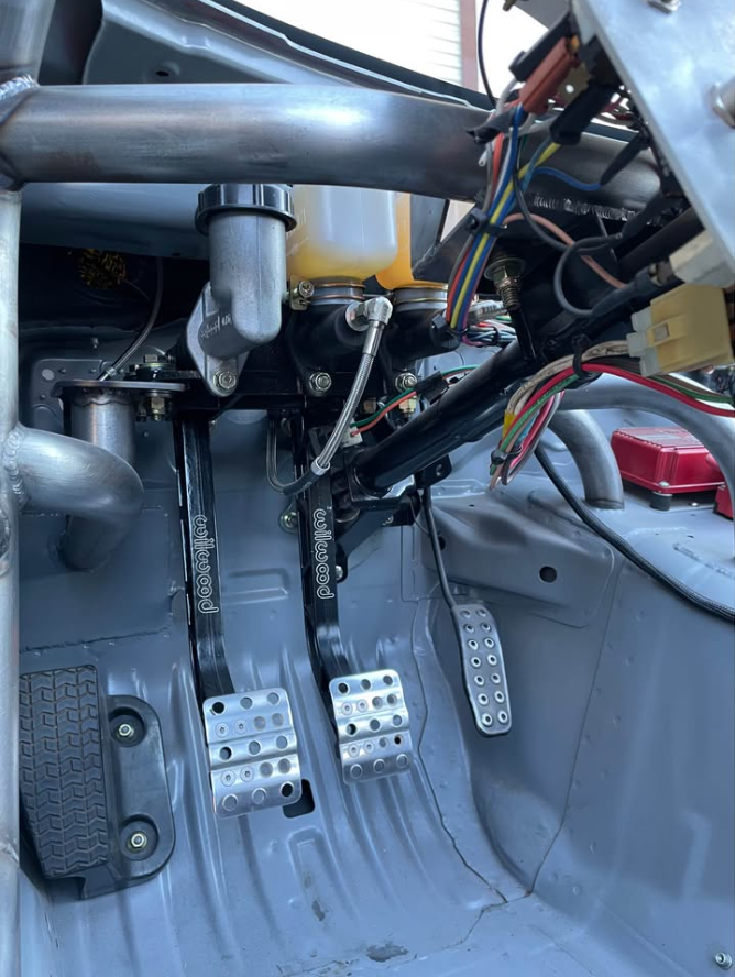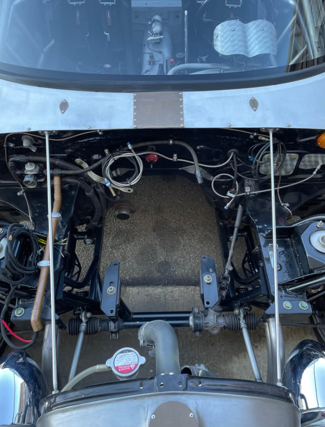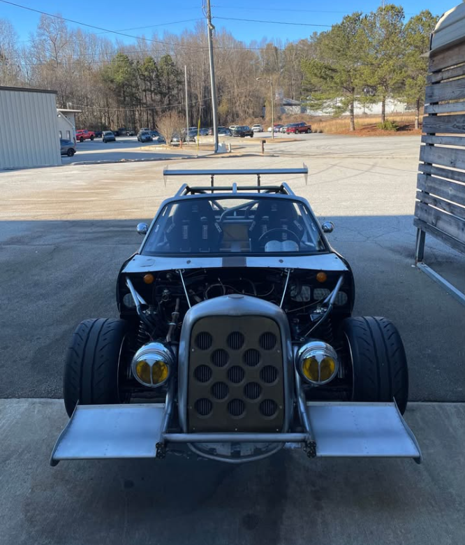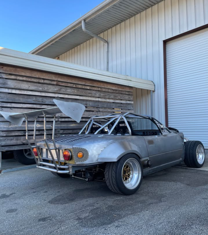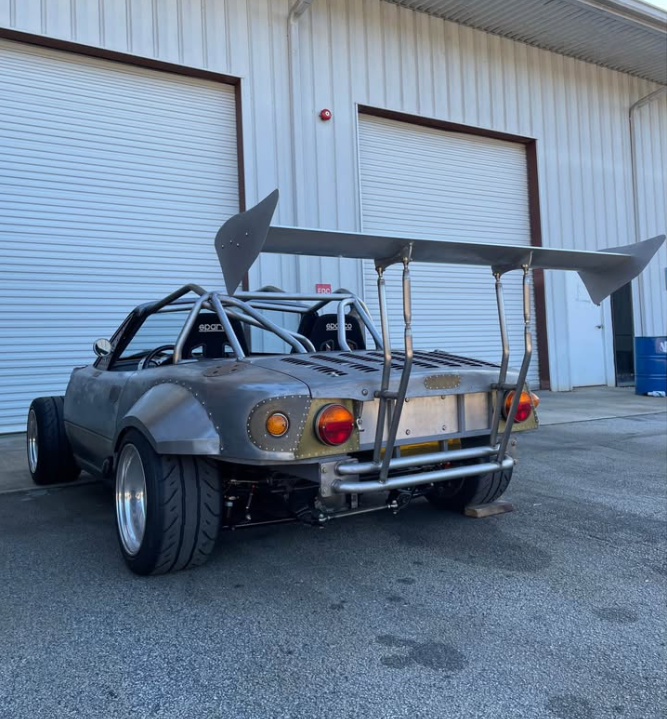 What's sitting in Georgia right now is less a Miata and more a purpose-built chassis that once was a Miata. Built from a completely bare shell, top and bottom, with a fully TIG-welded cage, this car has been configured around a small-block Ford and Tremec TKX drivetrain—though both the engine and transmission have since been pulled and sold, leaving a roller ready for its next powertrain. The suspension package is serious: BC coilovers, V8Roadsters tubular front and rear control arms, Danny George rear two-inch drop spindles, and the V8Roadsters front subframe that makes the swap geometry work. Braking is handled by a Flyin' Miata Wilwood six-piston front big brake kit with an unusual twin four-piston Wilwood setup on each rear corner. The Ford 7.5-inch clutch-type LSD with a 3.27 ratio sits out back. Weld Magnum Import Drag 15x10-13 wheels wrapped in Falken Azenis RT660 245/40-15 tires suggest where the priorities lie. An ASD hydraulic handbrake and Wilwood reverse swing pedal box complete the driver's environment, which is occupied by Sparco Sprint V seats on Garagestar rails and G-Force four-point harnesses. The exterior carries a wildly modified Model A front cowl and Indy car/Can-Am style aero elements—this is not a subtle build.